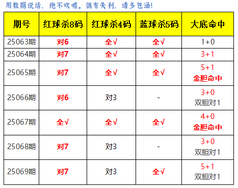 上期红球杀8码对7,杀4码对3,蓝球杀号全对,大底命中3+0。本期再接再厉!