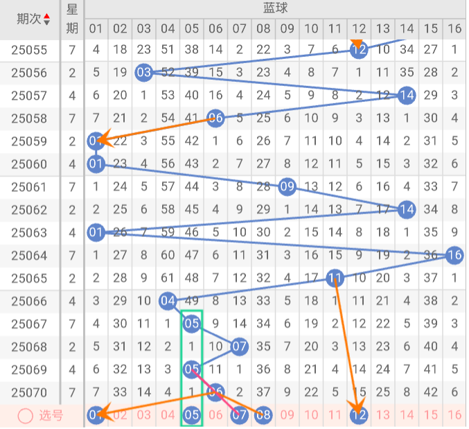 结合以上因素,本期蓝球推荐关注号码:01、05、07、08、12。