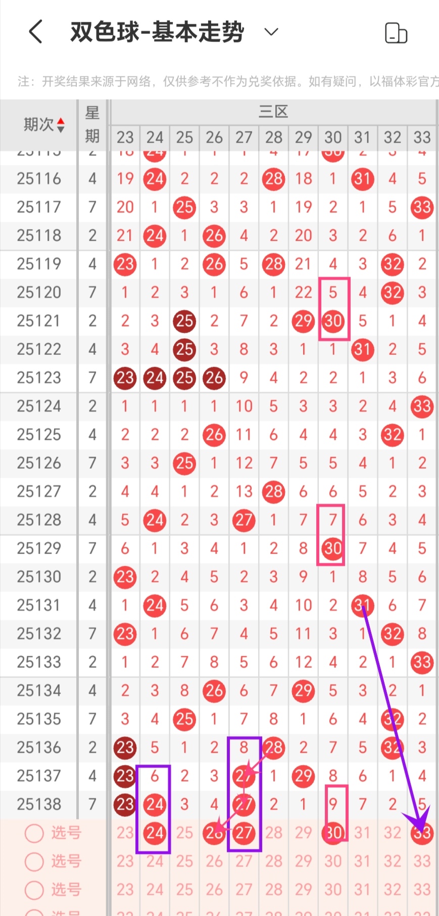 各位兄弟姐妹们大家好,我是nice,我喜欢研究数字的走势规律以及数据分析,通过同期次、同日期、同星期奖号等等出号规律进行杀号和做数据条件,红球杀号的准确率和稳定度都相当不错,首先通过上面的模块进行杀号可以做到杀红球12-15枚,然后将杀号带入到数据条件中进行选胆,这种方法屡试不爽帮助自己排除很多不必要的号码,将红球选号的数量控制在10-12枚,结合红球杀号带入到数据条件中选出的胆码,做胆拖组合控制成本