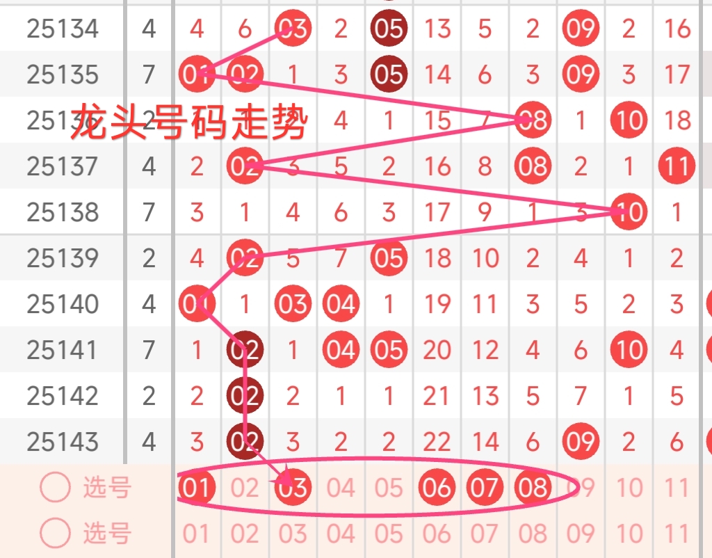 上期龙头号码为02,开出重号,振幅为零点,开出偶数号码。从近期龙头号码走势来看,近期龙头号码波动频繁。上期龙头号码为 02,为偶数号码。从近期龙头号码的走势来看,小偶数较为常见。预计本期龙头号码可以关注奇数龙头号码开出,结合近期龙头号码走势,近期龙头号码开出多在01-10区间开出。预计本期龙头号码可以继续关注红一区号码开出。本期还需关注遗漏值较高的号码,本期有望龙头号码热出的区域。综合考虑,本期龙头号码可重点关注01、03、06、07、08。