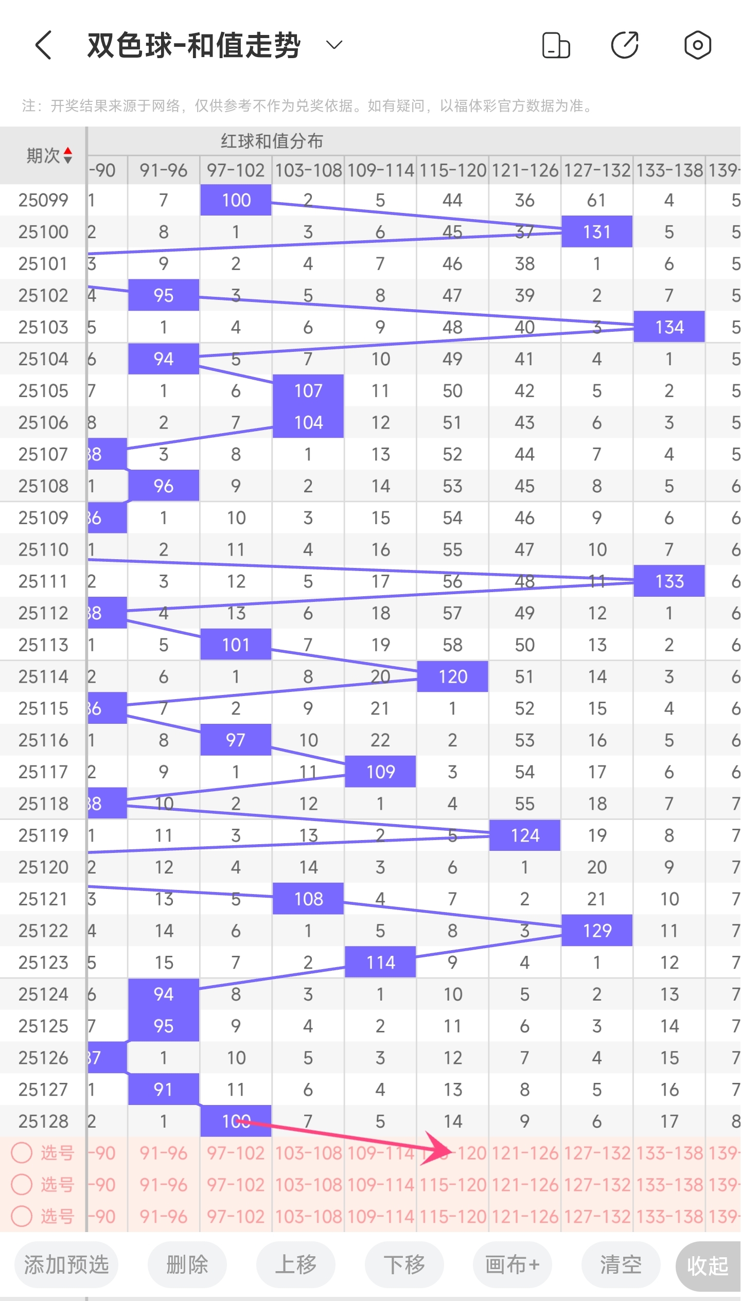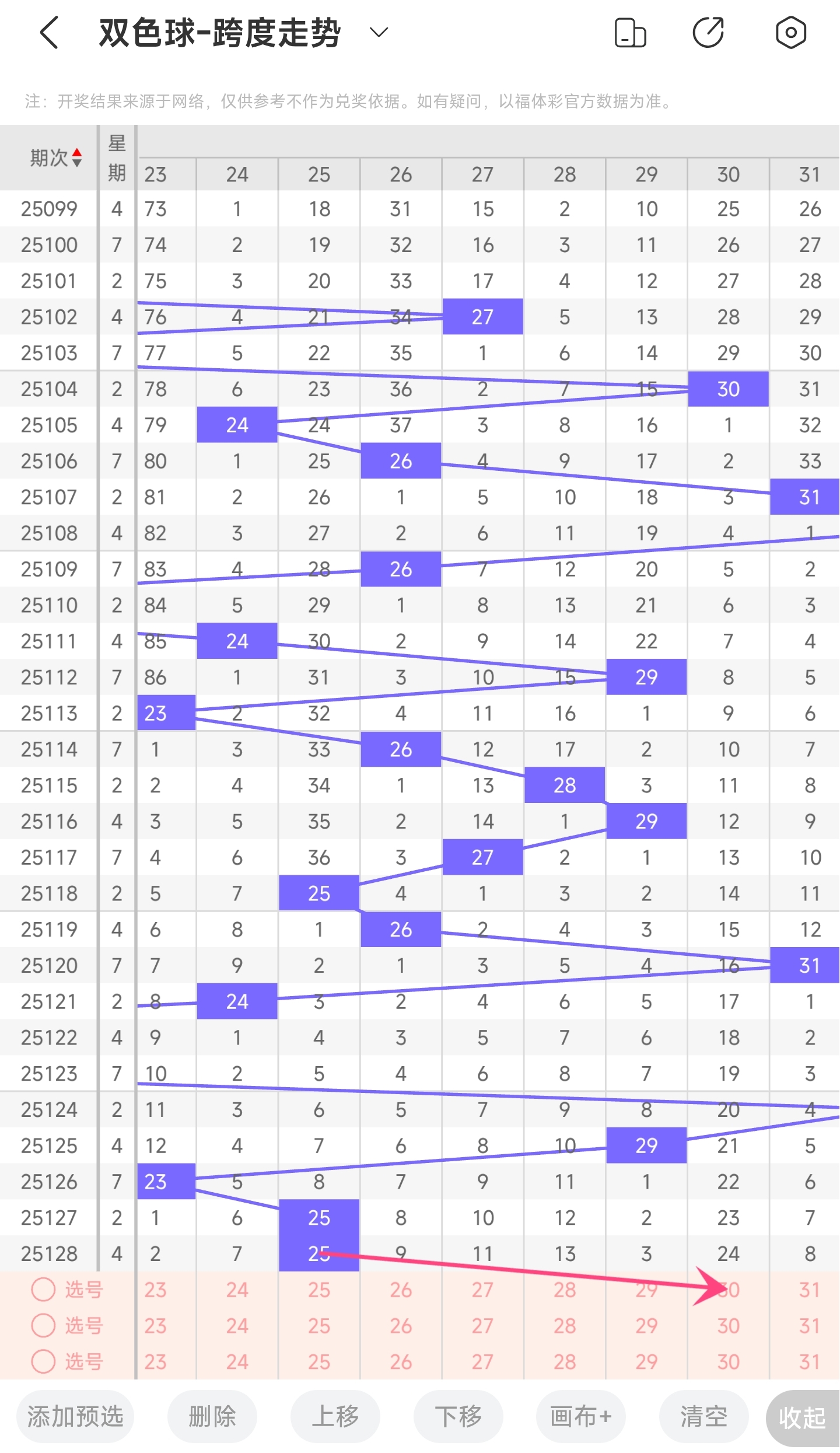 上期龙头为2,凤尾为27,跨度为25,往前一期跨度是25,偏移量为025跨度值是30期内开出的比较中间的跨度值。上升的空间还有不少,本期看好大跨度值,所以推测本期跨度趋势是往右,跨度变大,小概率往左,跨度值变小。