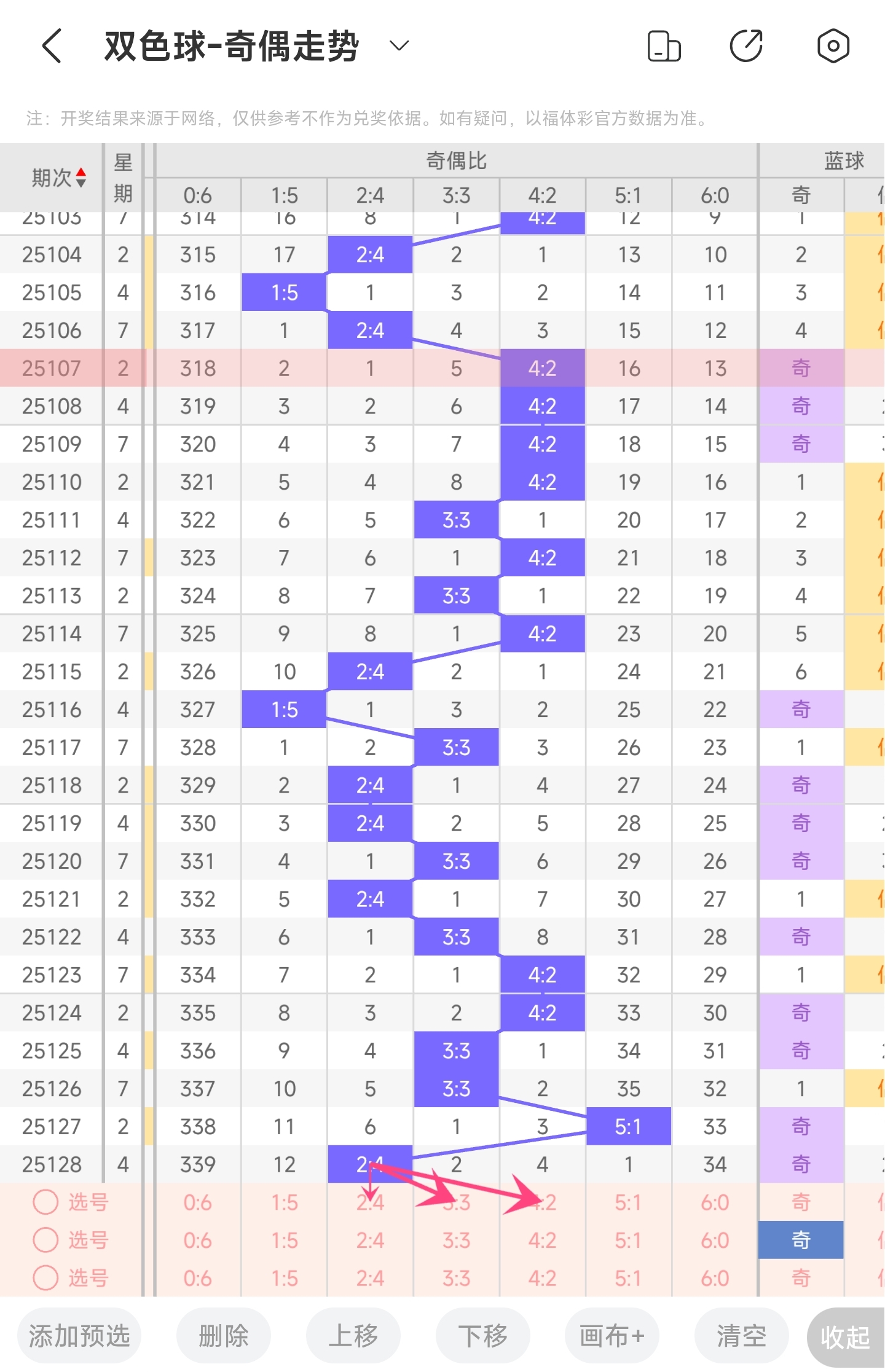 上期奇偶比为2:4,分别为偶偶偶奇偶奇。往前一期奇偶比为5:1。通过近30期内奇偶走势的数据分析,目前1:5奇偶比开出的概率是6.66%5:1奇偶比开出的概率是0%3:3奇偶比开出的概率是33.33%4:2奇偶比开出的概率是33.336%2:4奇偶比开出的概率是23.33%6:0奇偶比开出的概率是0%。与前一期相比,2:4奇偶比变大,4:2奇偶比概率变小。通过分析走势图,2:4奇偶比有回补的趋势,其次是3:34:2奇偶比。所以本期推测本期可能继续开2:4奇偶比,其次是开3:3奇偶比或者4:2奇偶比,最后是1:55:1奇偶比。