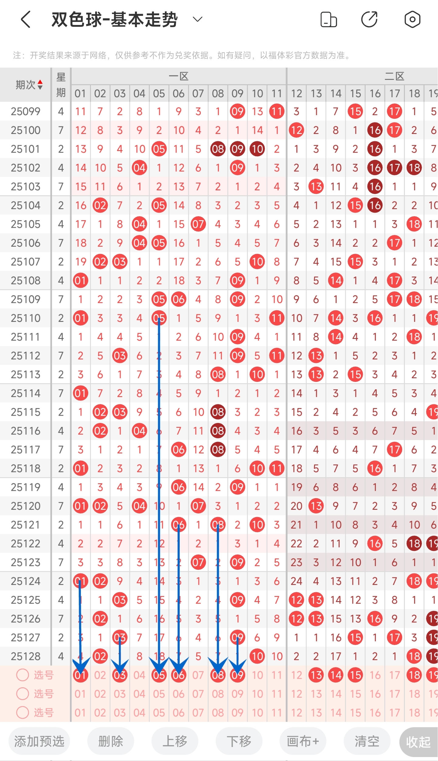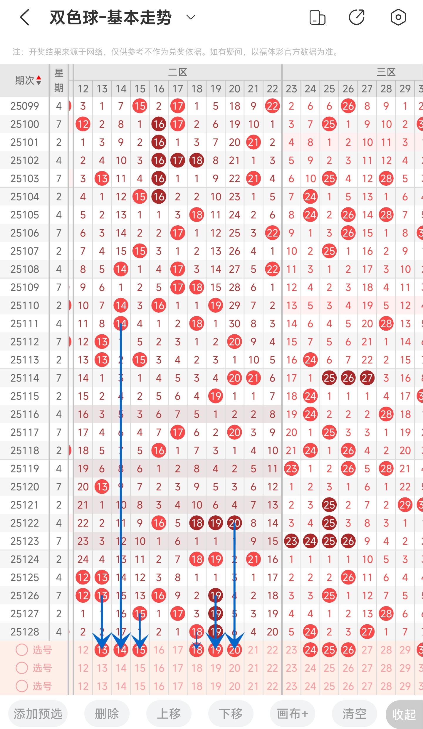 上一期二区开了1819号球。往前一期开了151719号球。通过分析走势图,可以看到上期开了2个号码是连号,其中19号是重号,本期大胆点继续关注连出的可能性。最近几期二区左边和中间的号码比较热门,本期我们主要关注左边和中间的号码,然后再结合冷热号和遗漏期数,本期我们可以关注一下131415181920等号码。综上所述推测本期可能开131415181920等号码。