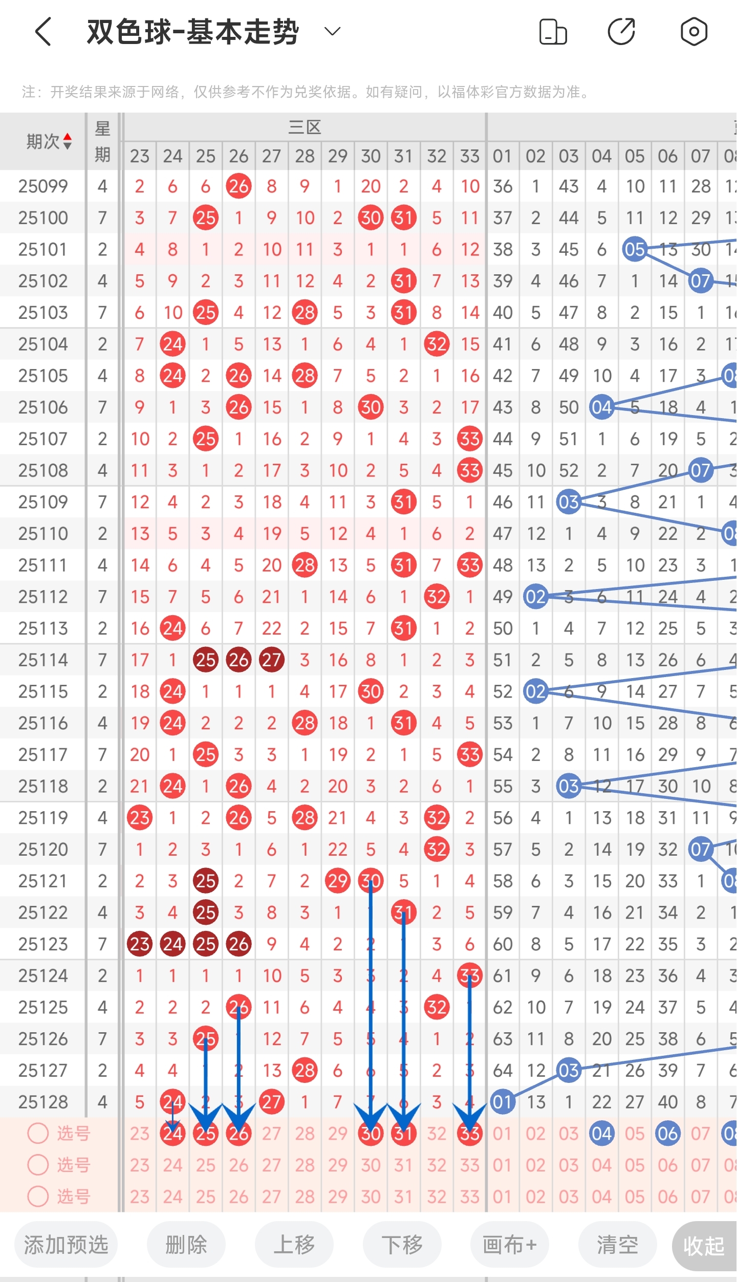 上一期三区开出了2427号球。往前一期出了28号球。通过走势图分析,可以看到最近几期开出的号码都在左边,右边的号码空了一段时间了,本期看好右边号码的回归,其次就是左边的号码要继续关注。最后再结合冷热号和遗漏期数,本期我们可以关注242526303133等号。综上所述本期我们推测有可能开出242526303133等号码。