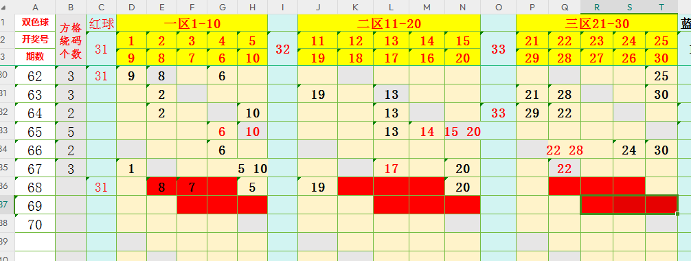二、本期三个分区分析 红球区划分三个区间:01 - 11 为一区,12 - 22 为二区,23 - 33 为三区。近五期开奖号码分别为:2、19、21、22、28、30;2、10、13、22、29、33;6、10、13、14、15、20;1、5、10、17、20、22;5、7、8、19、20、31。