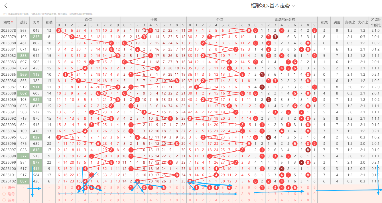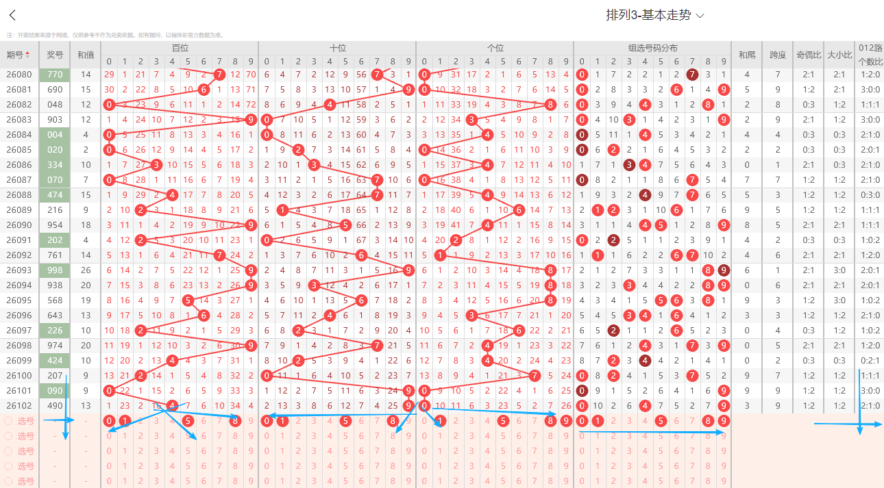 ①百位:上期开出小号偶数4号,在历史开奖记录中显示一般正常的奇偶周期平均在1~3期为普遍现象,上期出现奇偶互变为偶数1路号码,依据奇偶以及012路周期性规律的转变特征点即本期0路号码有开出的趋势1路号码注意预防。