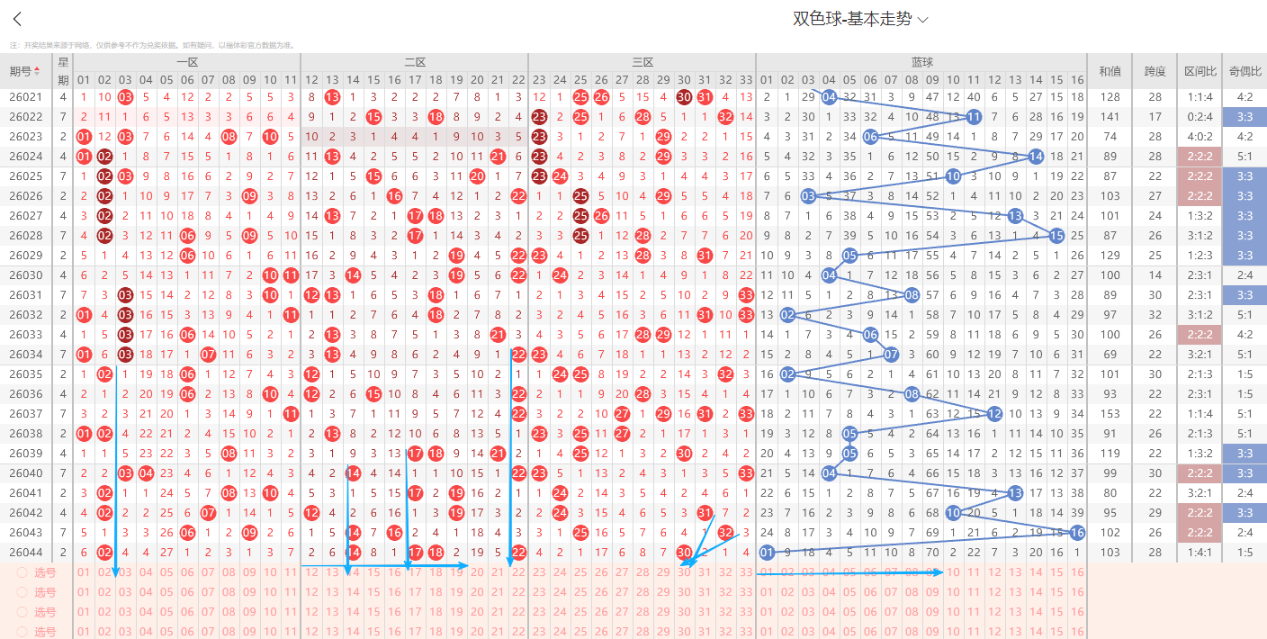 1、红球特征分析:(通过整体走势不难看出每期开奖号都具备以下明显的特征点)