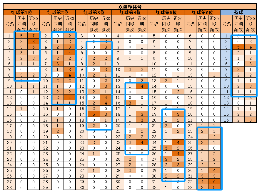 第6位,基本在24-33之间,历史同期频次最多的32;近30期,频次最多的为32,明显特征是合数优势;推荐重28-29-30-31-32-33。