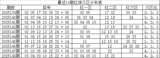 一区上期走热,开出4个红球,近10期开出25个红球,表现非常活跃,本期预计走温,开出1-2个红球,参考号码0611;二区上期走温,开出2个红球,近10期共开出20个红球,出号比例与理论持平,本期看好走热,开出3个红球,注意号码131720;三区上期走冷断区,近10期共开出15个红球,走势相对较冷,本期预计继续温冷,看好号码23