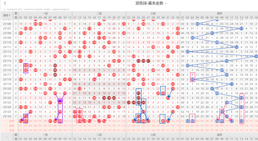 上一期三区开出了1个号码,本期三区大概率不会断区,本期三区出号数量可以考虑1-2个;本期三区需要关注的号码:24与25-26形成了斜连走势;25可能会重出;26为隔期码;27与25-26形成了斜连走势;此外遗漏值较低的30-31可以防出号1码;因此本期三区选号应该考虑24-25-26-27-30-31等号码。
