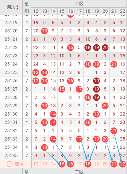 根据走势图可以看出当前区段,125期开出12.13二个号码球 ,126期开出12.13.16.19四个号码球 ,127期开出15.17.19三个号码球 ,128期开出18.19二个号码球 ,129期开出13.20二个号码球 ,130期开出14.19二个号码球 ,132期开出21一个号码球 ,133期开出14.17.19.20四个号码球 ,134期开出13一个号码球 ,135期没有开出号码球 ,按照如此规律本期当前区可能开出1单1双。我们看下当前区上期没有开出重叠号,那么本期当前区要定重叠号的情况下可关注13号码球。再看下当前区上期没有开出斜连号,当期选号得留意斜连12号码球。本区重点关注15.16.18.21.22
