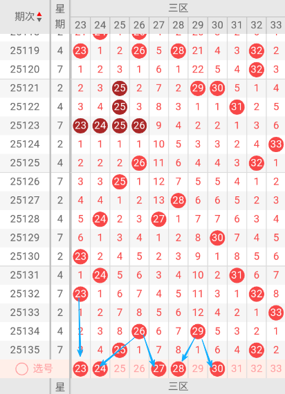 根据走势图可以看出当前区,125期开出26.32二个号码球 ,126期开出25一个号码球 ,127期开出28一个号码球 ,128期开出24.27二个号码球 ,129期开出30一个号码球 ,130期开出23一个号码球 ,132期开出23.32二个号码球 ,133期开出33一个号码球 ,134期开出个26.29二号码球 ,135期开出25.32二个号码球 ,按照如此规律判断本期当前区可能开出2单或1单。我们看下当前区上期没有开出重叠号,那么本期当前区要定重叠号的情况下可关注32码球。再看下当前区上期开出25斜连号,当期选号得留意24斜连号。本区重点关注23.24.27.28.30