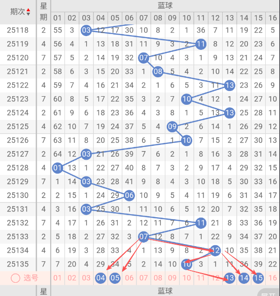 根据走势图近10期的走势看,蓝球在126期开出10蓝球之后,5小1大1小,再看下近10期的蓝球中冷码有回补的趋势,这种趋势规律本期判断极有可能开出双号,本期防蓝球16双号,蓝球本期重点关注04,05,13,14,15