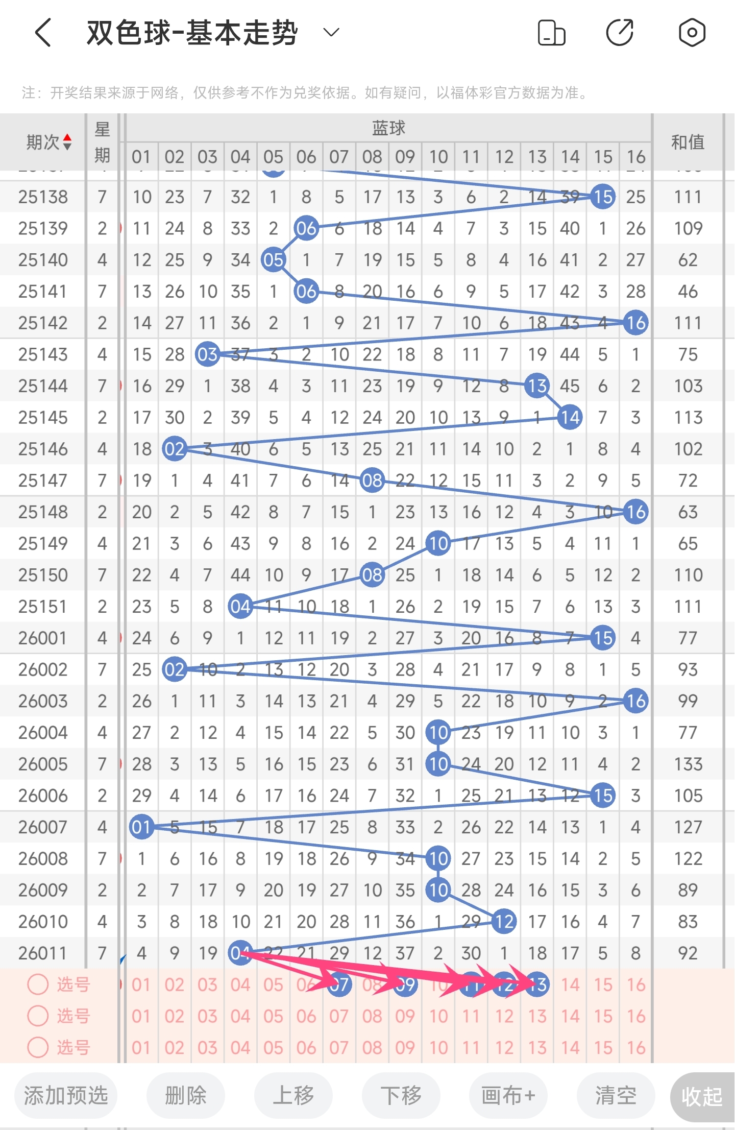 上期开出的是4,往前一期开出的是12。趋势往左移动,偏移量为8。通过分析目前蓝球的走势图,目前趋势是大概率右的,小概率往左。从偏移量看,上期偏移量又变大了不少,本期继续关注大偏移量号码,其次是稍微小一点偏移量的号码。最后再结合遗漏期数,以及冷热号,本期我们可以关注7,9,11,12,13等号码。综上所述本期推测可能开出7,9,11,12,13等号码。