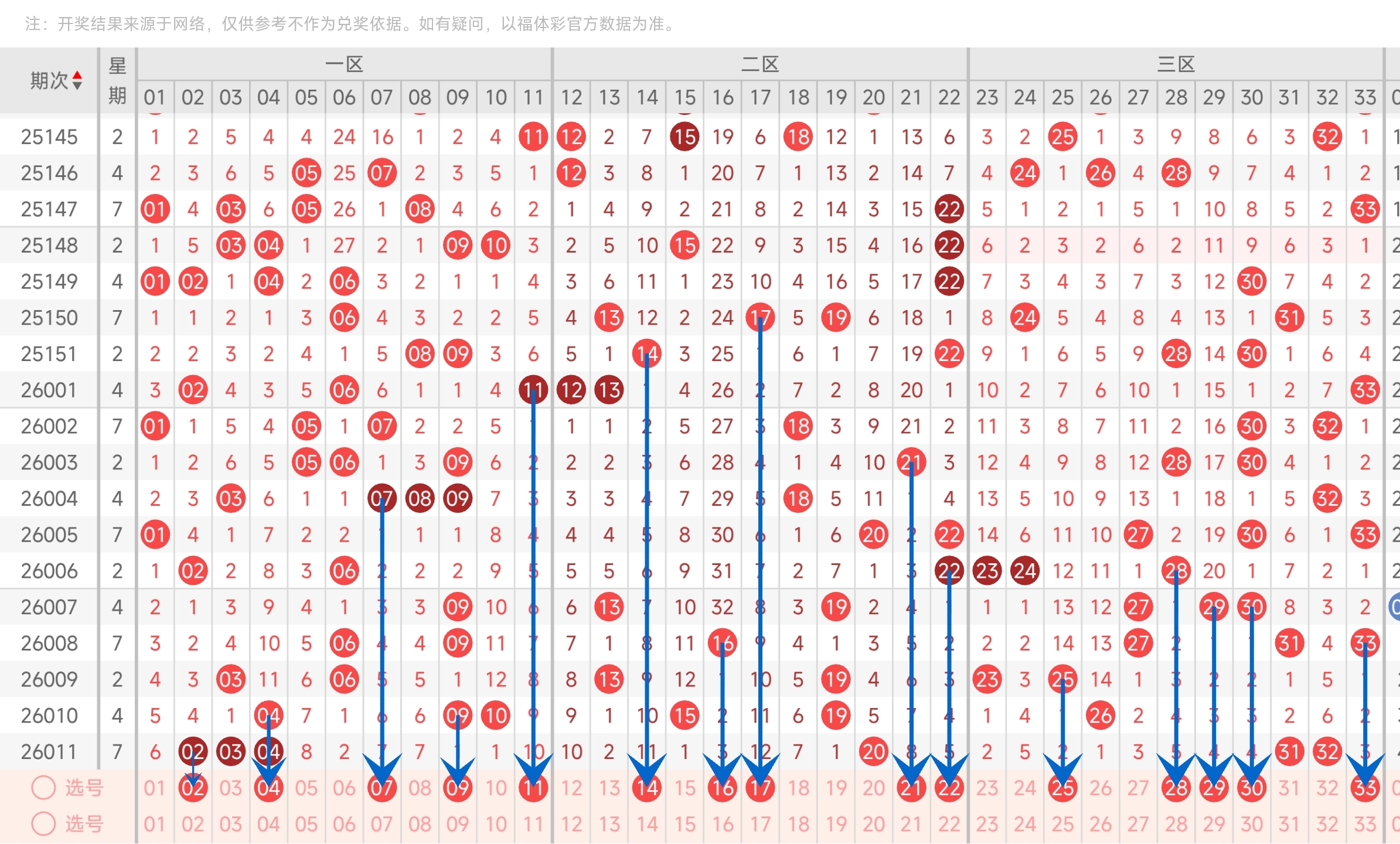 上一期三区开出了31,32号球。往前一期开26号球。通过走势图分析,可以看到上期凤尾开了32,回到了右边,最近几期中间位置没有开出凤尾,有可能回补,本期重点关注,其次是左右两边的号码。最后再结合冷热号和遗漏期数,本期我们可以关注25,28,29,30,33等号。综上所述本期我们推测有可能开出25,28,29,30,33等号码。