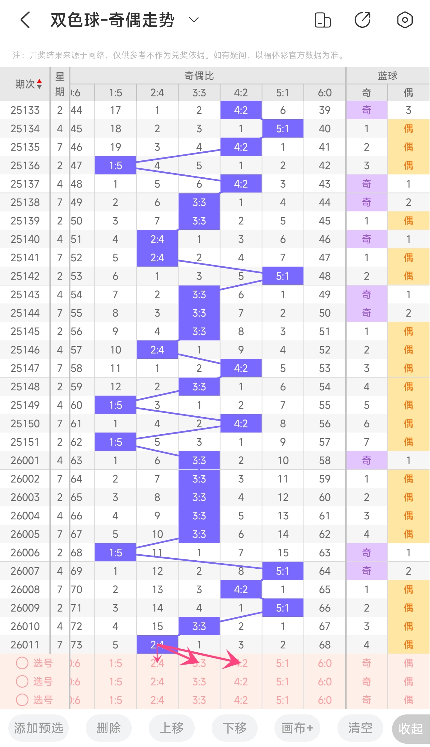 上期奇偶比为2:4,分别为偶奇偶偶奇偶。往前一期奇偶比为3:3。通过近30期内奇偶走势的数据分析,目前1:5奇偶比开出的概率是13.33%,5:1奇偶比开出的概率是13.33%,3:3奇偶比开出的概率是40%,4:2奇偶比开出的概率是20%,2:4奇偶比开出的概率是13.33%,6:0奇偶比开出的概率是0%。与前一期相比,概率没有变化。通过分析走势图,上期开了2:4奇偶比,本期比较看好3:3奇偶比,其次是4:2,然后是2:4奇偶比。所以本期推测本期可能开3:3奇偶比,其次是4:2奇偶比,然后是2:4奇偶比,最后是1:5和5:1奇偶比。