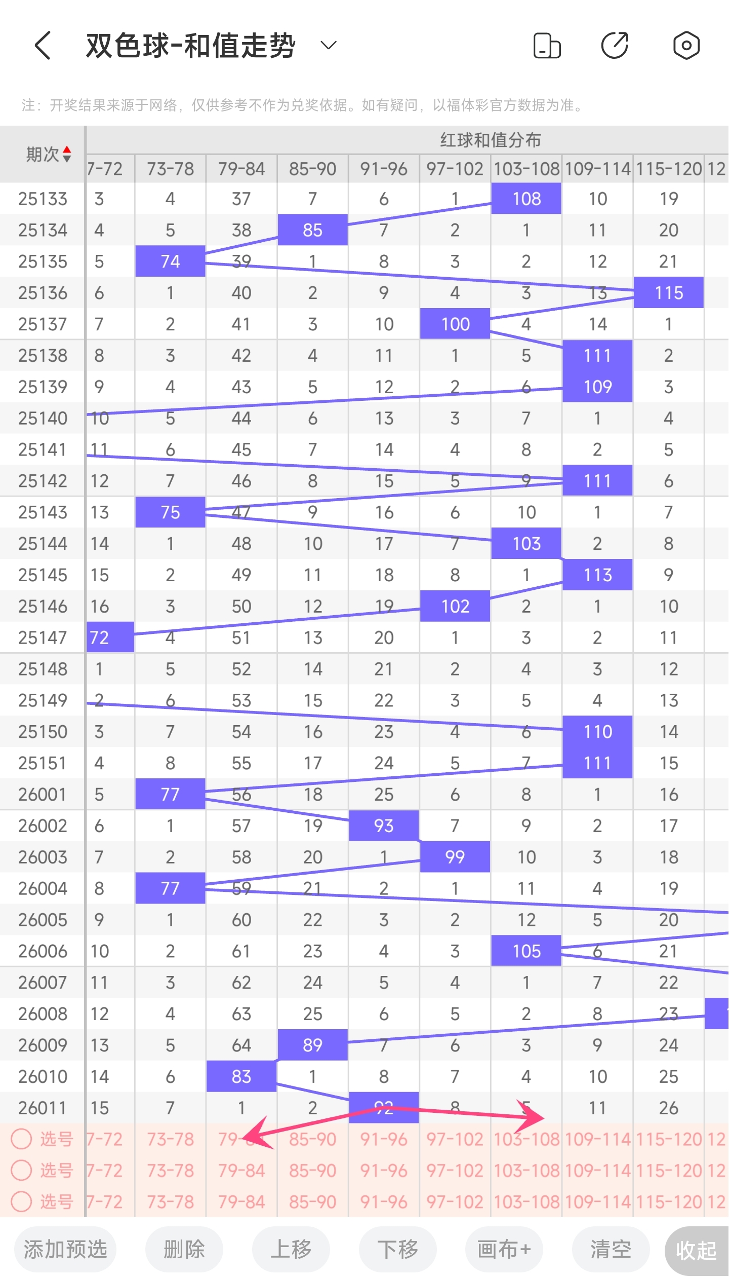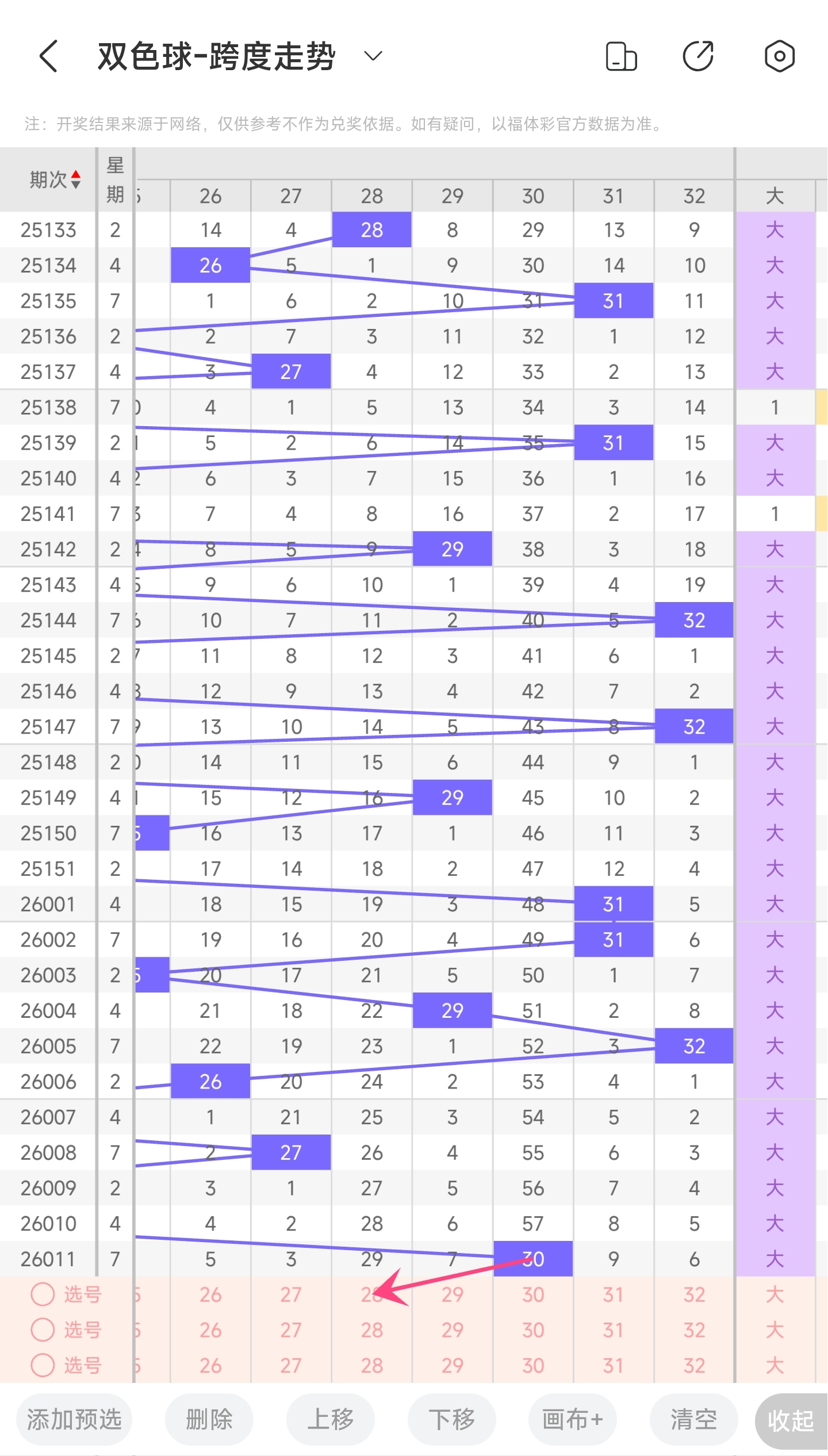 上期龙头为2,凤尾为32,跨度为30,往前一期跨度是22,偏移量为8。30跨度值是30期内开出比较大跨度值。上升的空间比较小,下降空间比较大,本期看好跨度变小,所以推测本期跨度趋势是往左的,跨度变小,小概率往右,跨度变大。