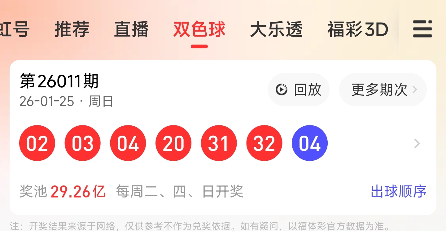 红球开出2,3,4,20,31,32,蓝球开出4。