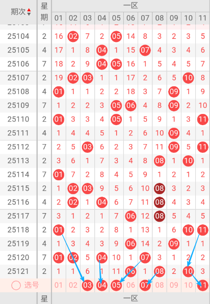 根据走势图可以看出当区段, 112期开出了03.09.11三个号码球,113期开出了08.10二个号码球,114期开出了01一个号码球,115期开出来02.03.08三个号码球,116期开出来02.04.08三个号码球,117期开出了06.08二个号码球,118期开出了01.10.11三个号码球,119期开出06.09二个号码球 ,120期开出01.02.04.07四个号码球 ,121期开出06.08.10三个号码球 ,按照如此规律本期当前区可能会开出1单或1单1双。我们看下当前区上期没有开出重叠号,那么本期当前区要定重叠号的情况下可关注10号码球。再看下当前区段上期开出06.08斜连号,当期选号得留意11斜连号。建议重点关注03.04.05.07.11