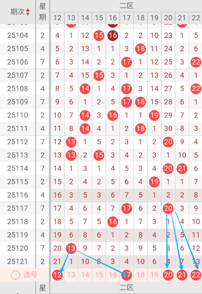 根据走势图可以看出当前区段,112期开出了13.20二个号码球,113期开出了13.15二个号码球,114期开出了20.21二个号码球,115期开出来19一个号码球,116期没有开出号码球,117期开出了17.20二个号码球,118期开出了16一个号码球,119期没有开出个号码球 ,120期开出13一个号码球 ,121期没有开出号码球 ,按照如此规律本期当前区可能开出1单1双。我们看下当前区上期没有开出重叠号,那么本期当前区要定重叠号的情况下可关注13号码球。再看下当前区上期没有开出斜连号,当期选号得留意斜连12号码球。本区重点关注12.17.20.21.22