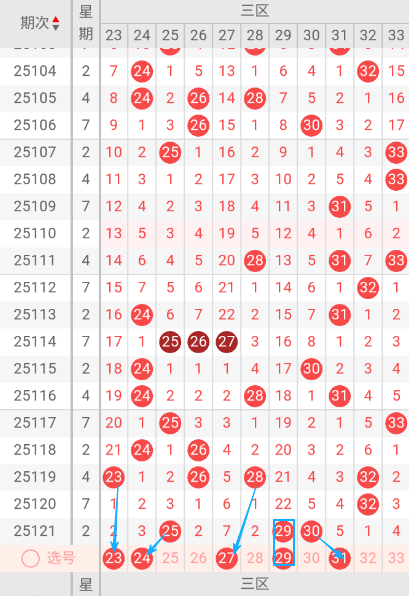 根据走势图可以看出当前区,112期开出了32一个号码球,113期开出了24.31二个号码球,114期开出了25.26.27三个号码球,115期开出来24.30二个号码球,116期开出来24.28.30三个号码球,117期开出了25.33二个号码球,118期开出了24.26二个号码球,119期开出23.26.28.32四个号码球 ,120期开出32一个号码球 ,121期开出25.29.30三个号码球 ,按照如此规律判断本期当前区可能开出2单或1单1双。我们看下当前区上期没有开出重叠号,那么本期当前区要定重叠号的情况下可关注29码球。再看下当前区上期没有开出斜连号,当期选号得留意24斜连号。本区重点关注23.24.27.29.31