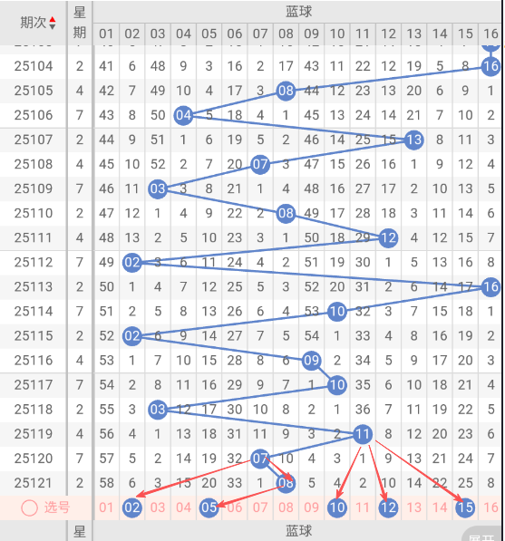 根据走势图近10期的走势看,蓝球在107期开出13蓝球之后,3小1大1小2大1小2大1小1大2小,再看下近10期的蓝球热码有回补的趋势,这种趋势规律本期判断极有可能开出小号,本期防蓝球12大号,蓝球本期重点关注02,05,10,12,15