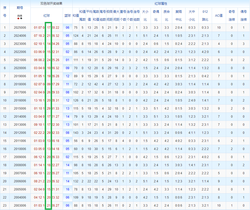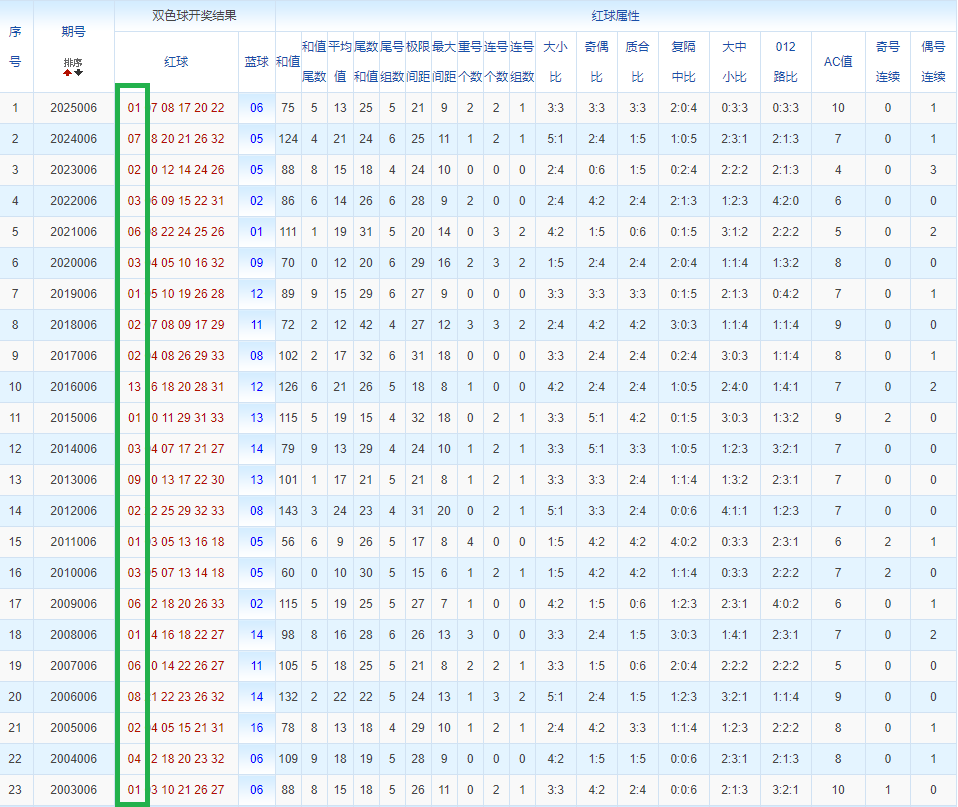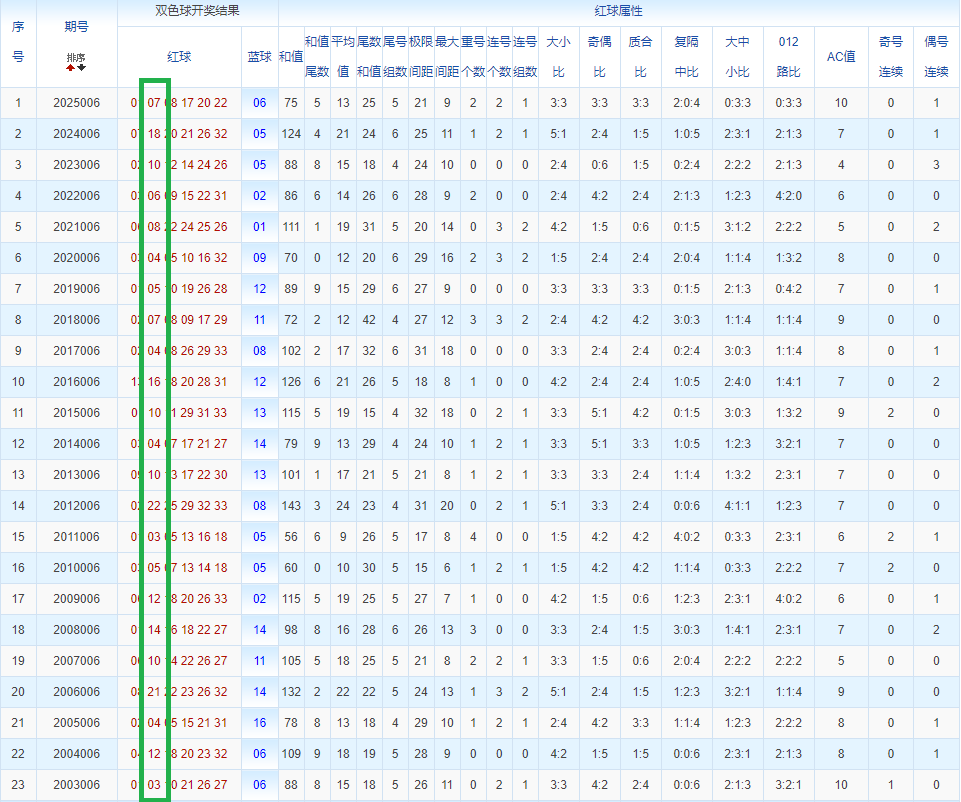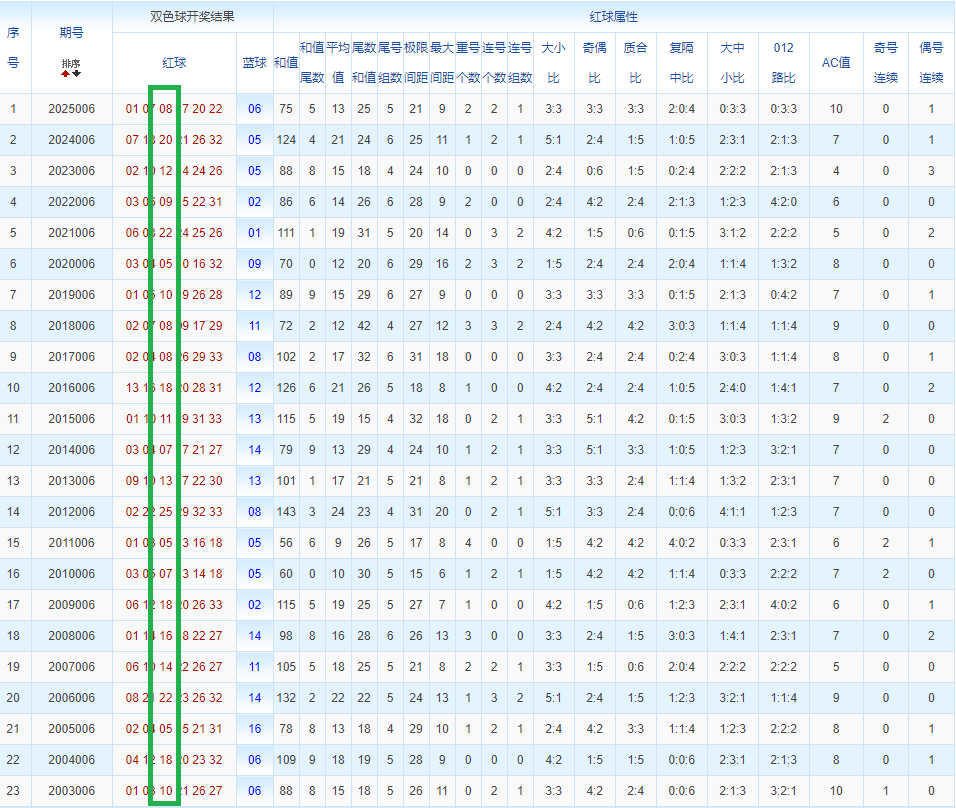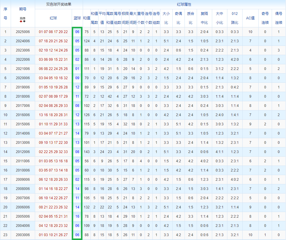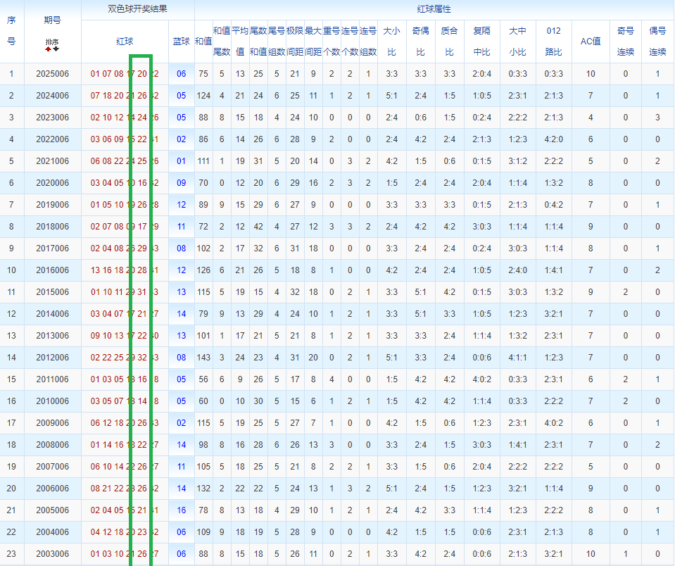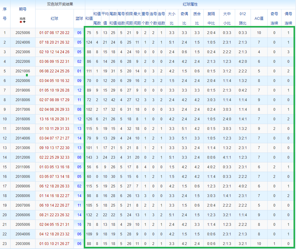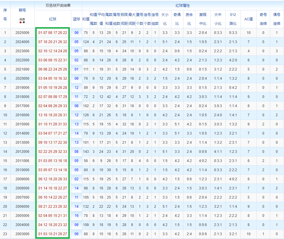 通过观察,我发现双色球往年同期的开奖数据与本期号码之间存在显著关联。具体来说,在红球中,从第一位至第六位,通常会有约4个位置上的数字与往年同期相同位置的号码一致;而蓝球号码中,也有多期开奖结果直接包含了往年同期的数字。因此,我们可以借助往年同期各位置上的号码,作为分析本期开奖情况的重要依据。在此基础上,还可结合往年同期的其他相关条件,进行综合性的号码组合推荐。