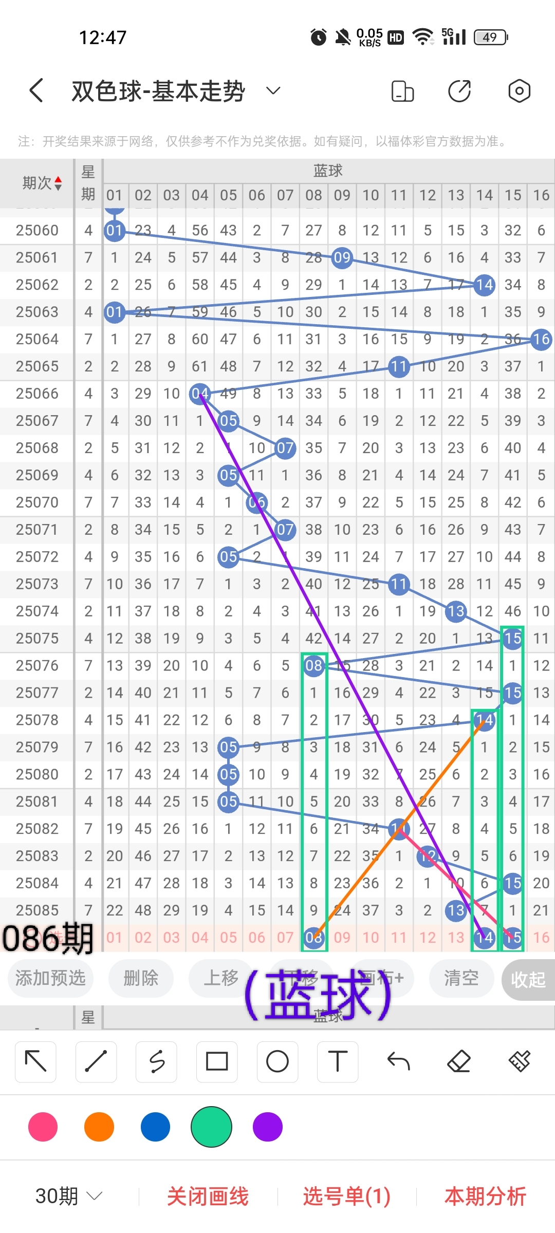 小梁根据图中画线思路,最后给大家汇总提供一下本期红球、蓝球数据,供大家参考:
