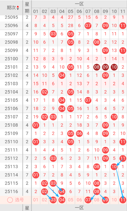 根据走势图可以看出当区段,107期开出了02.03.10三个号码球,108期开出了01.09二个号码球,109期开出05.06.09三个号码球 ,110期开出了01.05.11三个号码球,111期开出了09一个号码球, 112期开出了03.09.11三个号码球,113期开出了08.10二个号码球,114期开出了01一个号码球,115期开出来02.03.08三个号码球,116期开出来02.04.08三个号码球,按照如此规律本期当前区可能会开出1单或1单1双。我们看下当前区上期开出02.08重叠号,那么本期当前区要定重叠号的情况下可关注04号码球。再看下当前区段上期开出02.04斜连号,当期选号得留意09斜连号。建议重点关注03.04.07.09.11