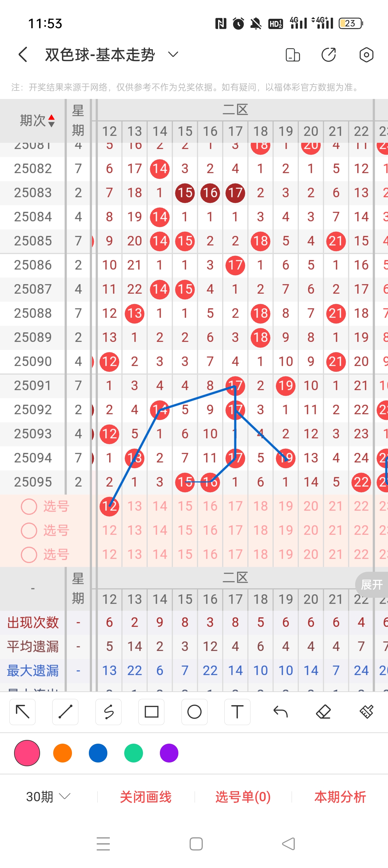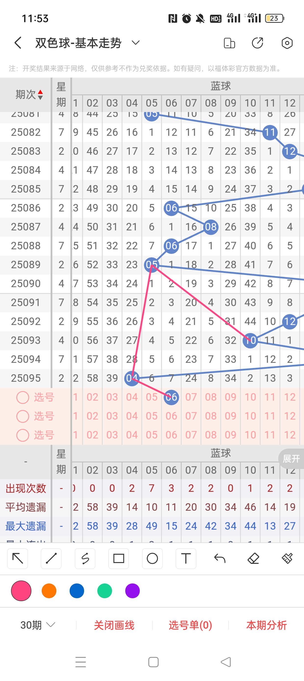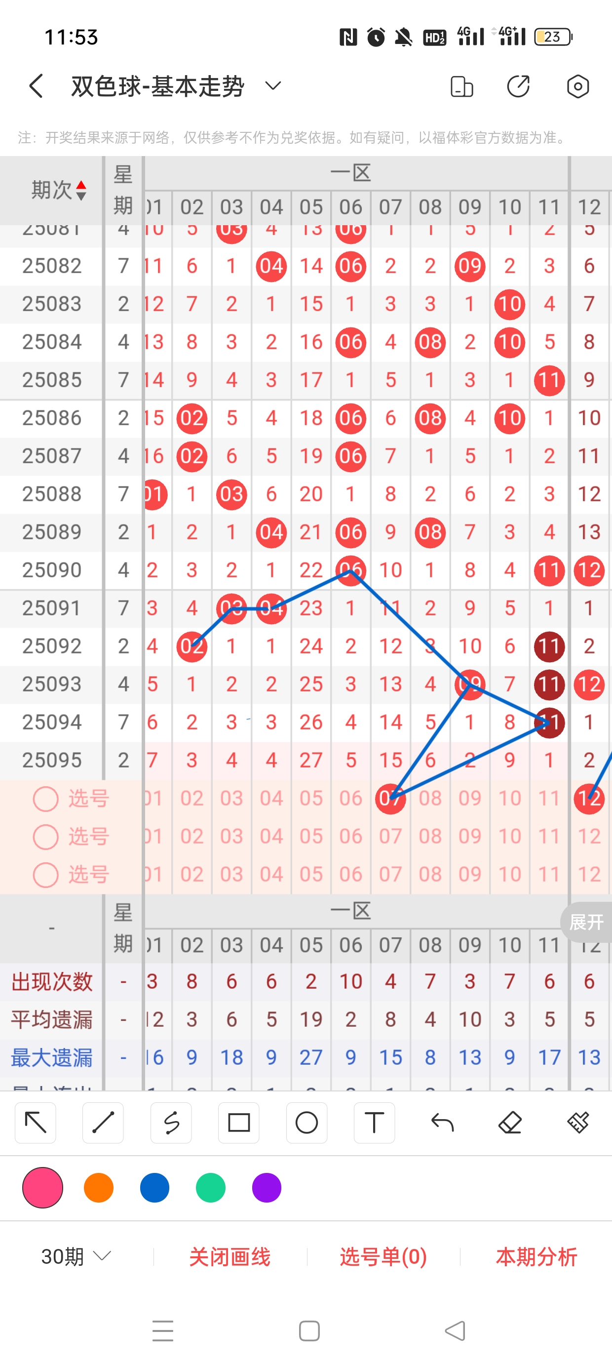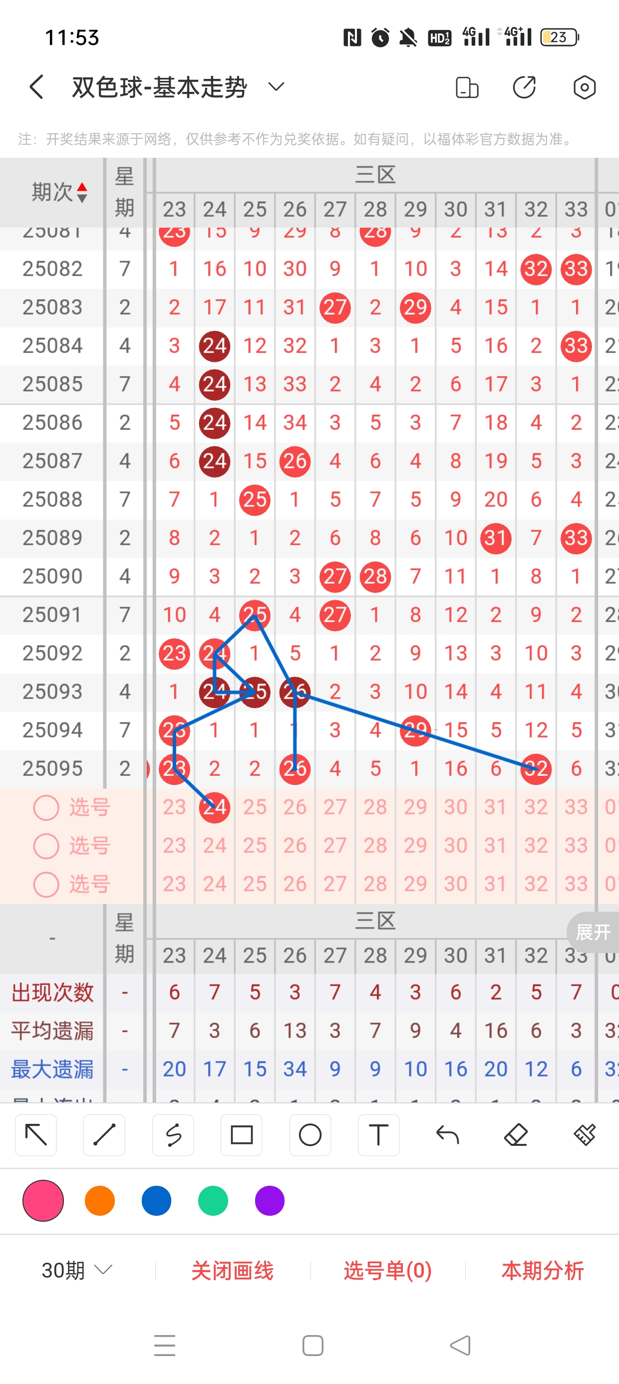 25095期开奖结果:15、16、22、23、26、32+4,奇偶比2:4,大小比4:2,和值108,012路1:2:3,邻孤传0邻5孤1传,同尾号16、26、22、32,传号23,连号15、16、22、23。总结完毕,下面开始本期分析。