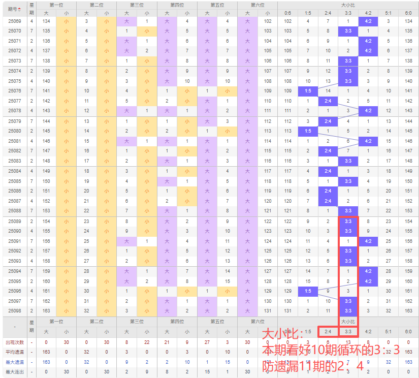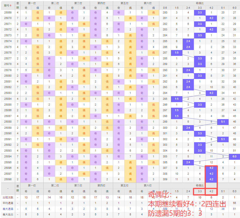 上期奇偶比:4:2,近10期奇偶比出现情况:2:4、3:3、5:1、3:3、3:3、6:0、2:4、4:2、4:2、4:2,最近10期出现4期3:3,出现3期4:2,出现2期2:4,出现1期5:1,出现0期1:5,出现1期6:0,出现0期0:6,根据近10期规律本期看好4:2四连出,防遗漏5期的3:3,综上所述推荐奇偶比推荐:3:3,重点关注:4:2。