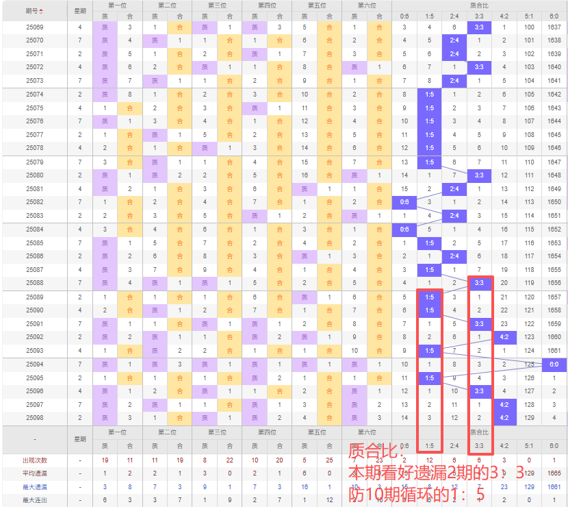 上期质合比:4:2,近10期质合比出现情况:1:5、1:5、3:3、4:2、1:5、6:0、1:5、3:3、4:2、4:2,最近10期出2期3:3,出现3期4:2,出现0期2:4,出现0期5:1,出现4期1:5,出现1期6:0,出现0期0:6,根据近10期规律本期看好遗漏2期的3:3,防10期循环的1:5,综上所述推荐质合比推荐:1:5,重点关注:3:3。