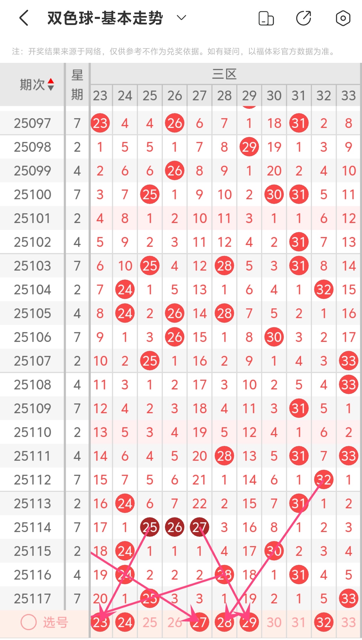 下面双色球的第三区间走势图分析: