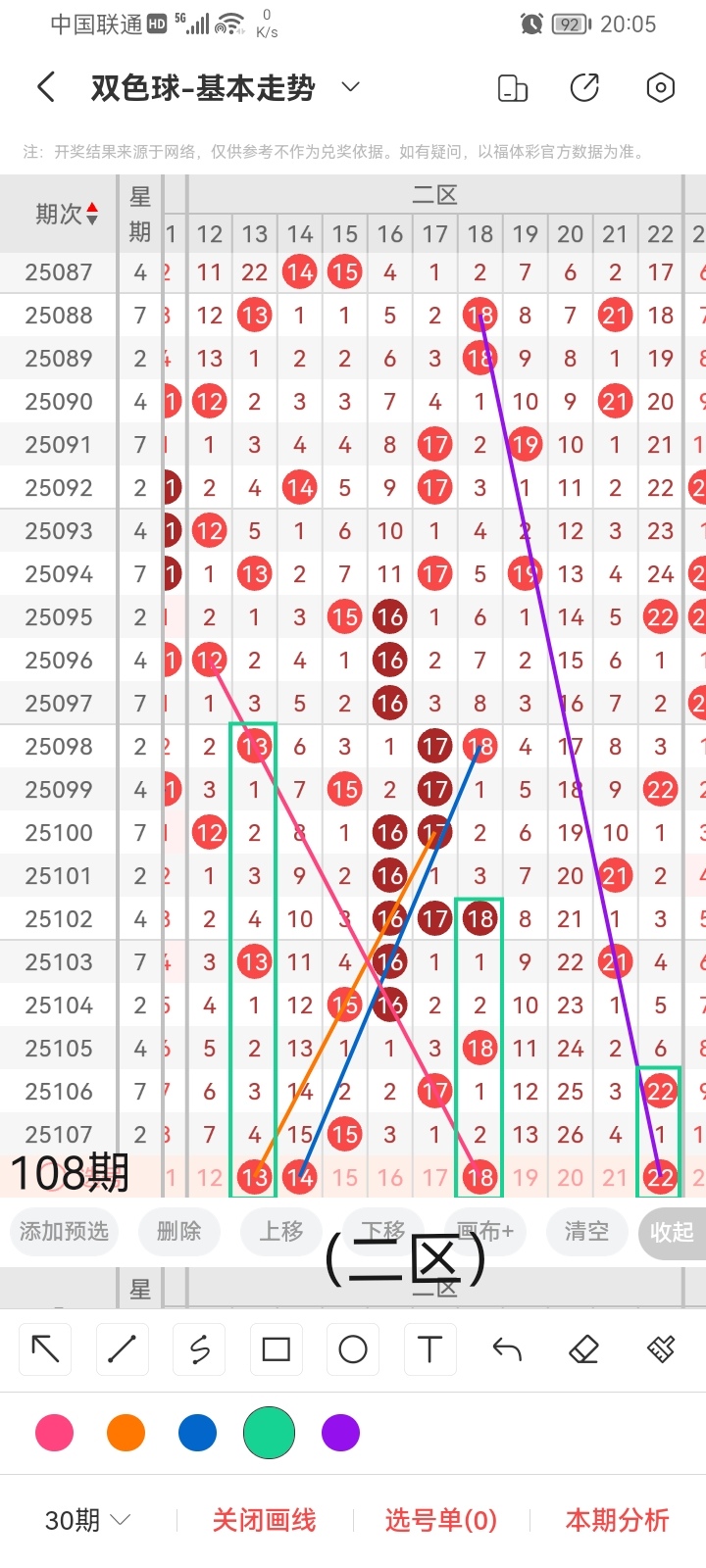 通过以上对上期的简单回顾,下面进入双色球第2025108期(下面简称本期)的选号分析: