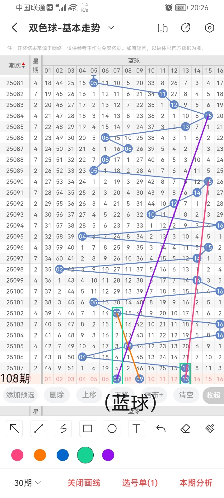 小梁根据图中画线思路,最后给大家汇总提供一下本期红球、蓝球数据,供大家参考: