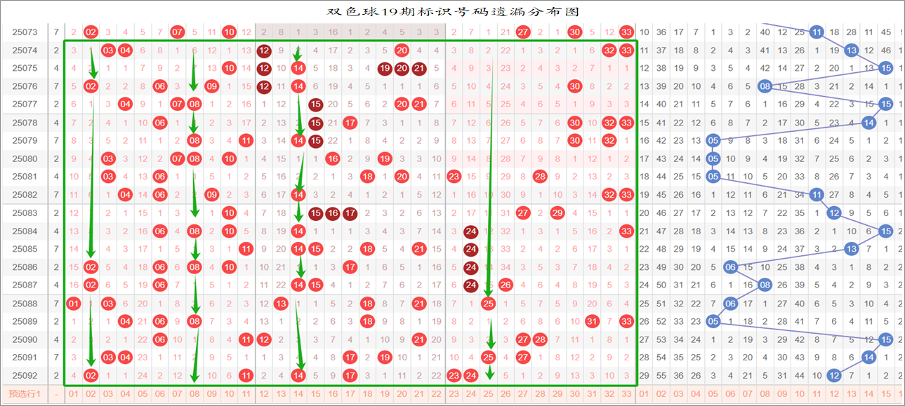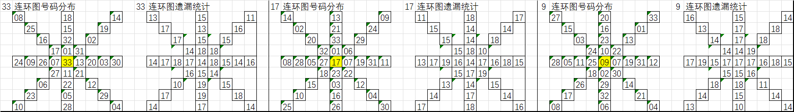 由于数据量大,不一一统计,下图为各个号码分别在33、17、9连环图上的遗漏统计汇总图: