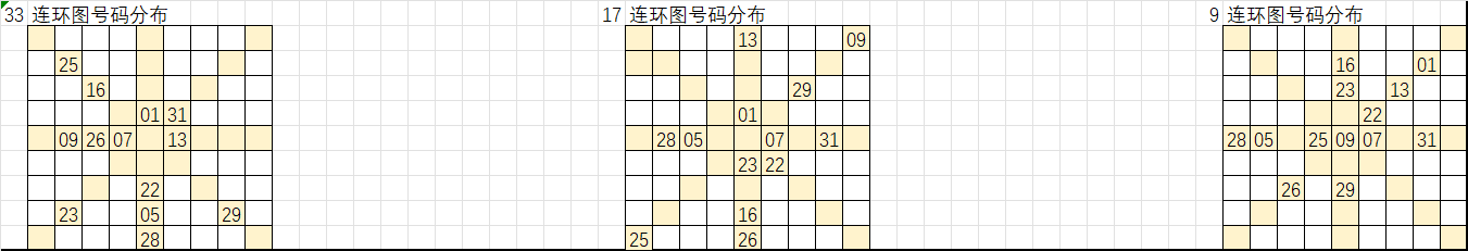 以上是33、17、9的连环图,可以在一起彩平台的九转连环图中查看历期号码分布,以当前期数来看,历史同期共有19期(2003-2023),那么我们就以19期号码来进行遗漏统计,然后把每个号码在近19期的遗漏总数统计出来,分别带入33、17、9的连环图,取出遗漏值大于16的号码,把这些号码在“环上”和“轴上”的相邻号码取出来进行统计,选取出次前15的号码作为大底。
