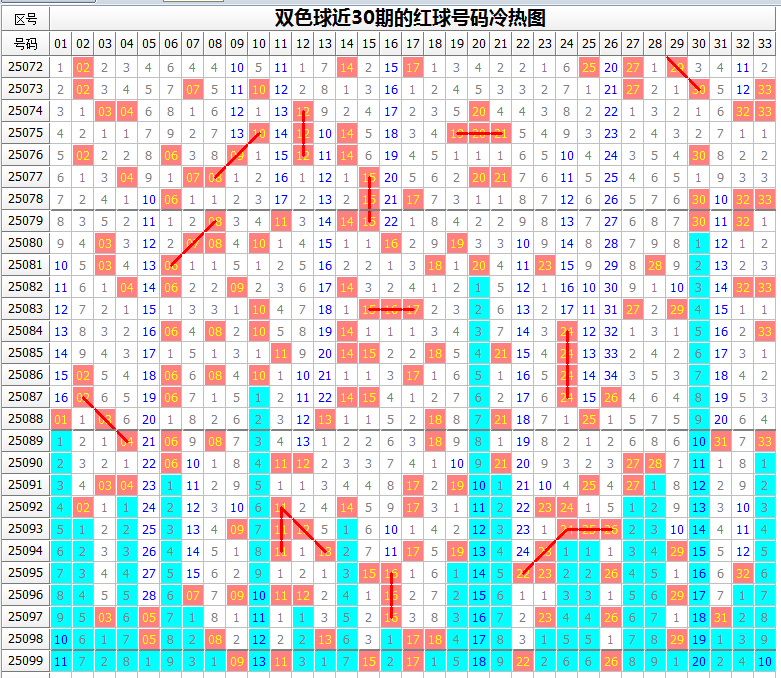 双色球100期冷热号码及出号趋势分析(具体号码可参见上图或会员文章的觅宝图):