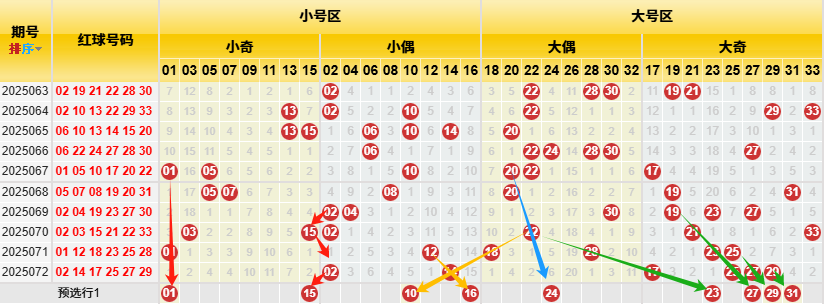 1、小大奇偶交叉图(小奇数红色箭标、小偶数黄色箭标、大偶数蓝色箭标、大奇数绿色箭标)