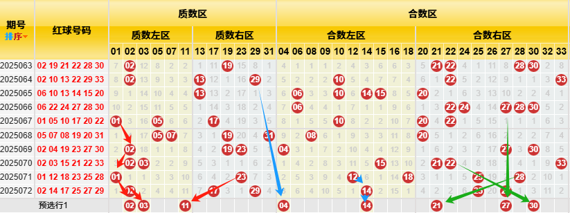 【数据参数】 根据前区质合小大属性,组合成上图质数区1、2、3、5、7、11、13、17、19、23、29、31和合数区4、6、8、9、10、12、14、15、16、18、20、21、22、24、25、26、27、28、30、32、33,质数区分为质数左区1、2、3、5、7、11和质数右区13、17、19、23、29、31;合数区分为合数左区4、6、8、9、10、12、14、15、16、18)和合数右区20、21、22、24、25、26、27、28、30、32、33。