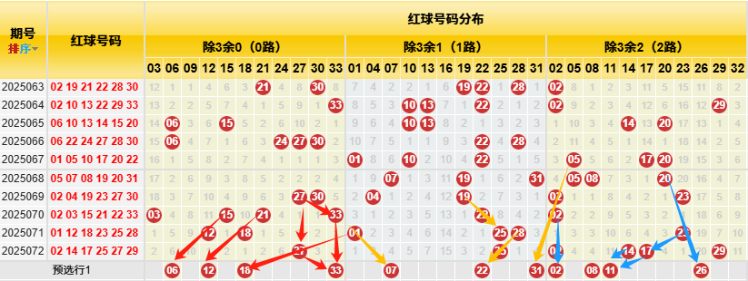 【数据参数】 根据前区除3余数,组合成上图分别为余0路(简称0路)3、6、9、12、15、18、21、24、27、30、33;余1路(简称1路)1、4、7、10、13、16、19、22、25、28、31; 余2路(简称2路)2、5、8、11、14、17、20、23、26、29、32。
