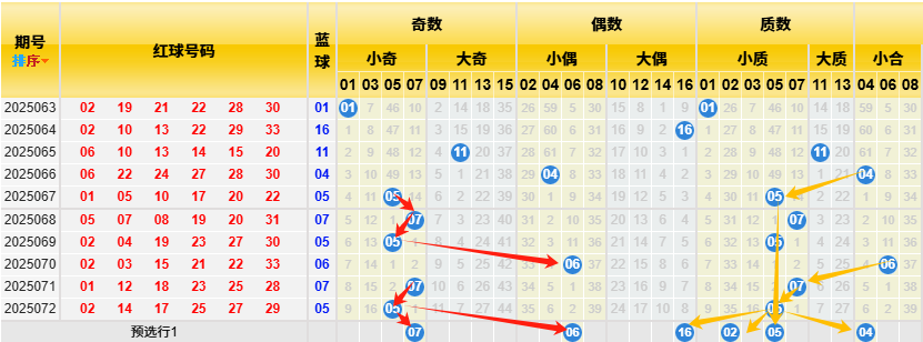 【数据参数】根据前区除4余数,组合成上图分别为余0路(简称0路)4、8、12、16、20、24、28、32);余1路(简称1路)1、5、9、13、17、21、25、29、33;余2路(简称2路)2、6、10、14、18、22、26、30;余3路(简称3路)3、7、11、15、19、23、27、31。