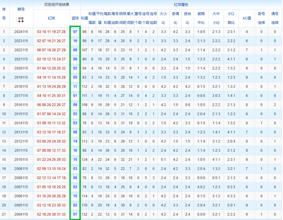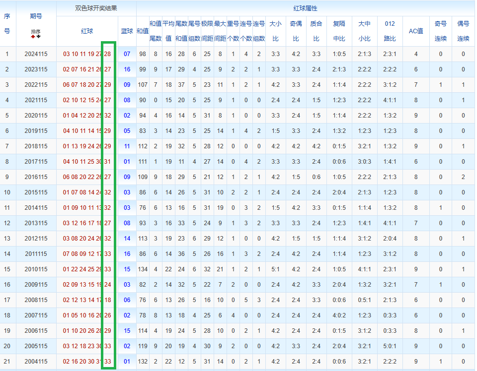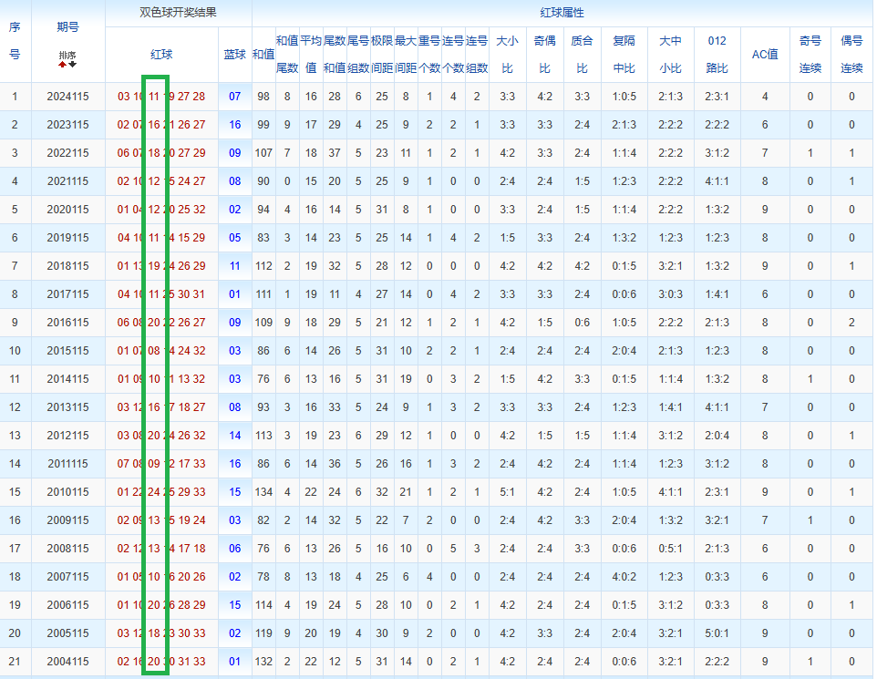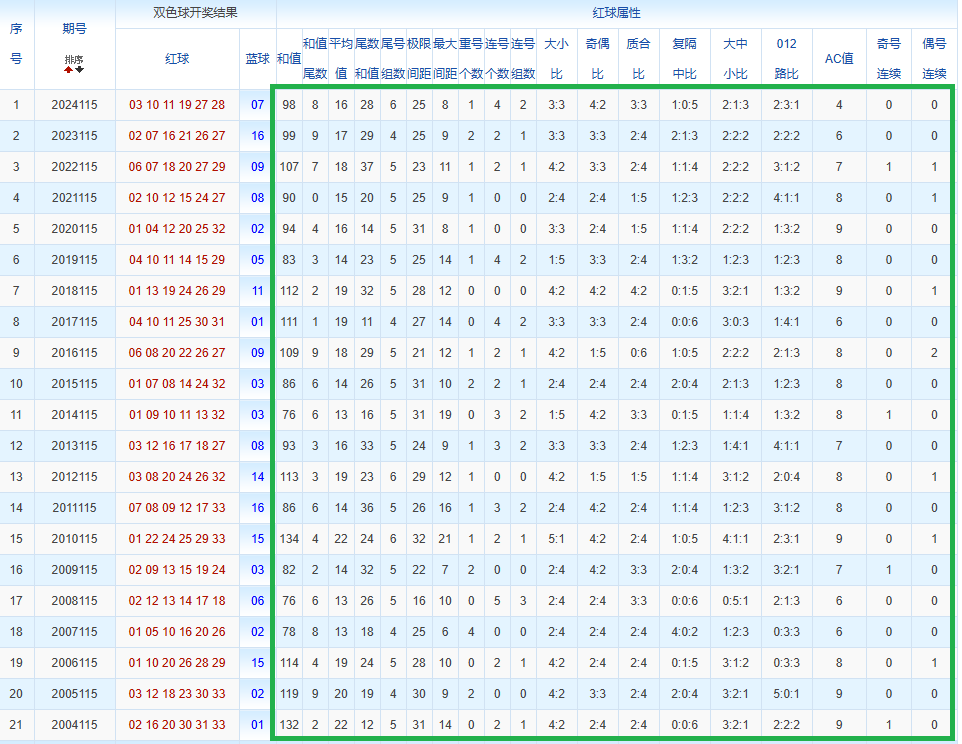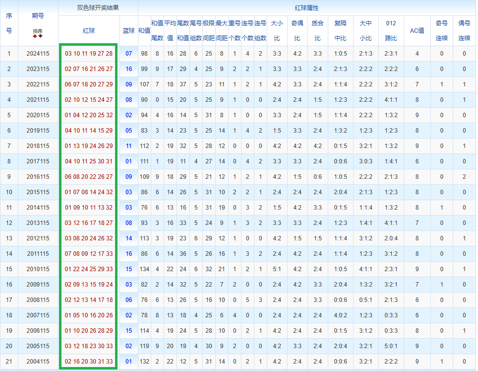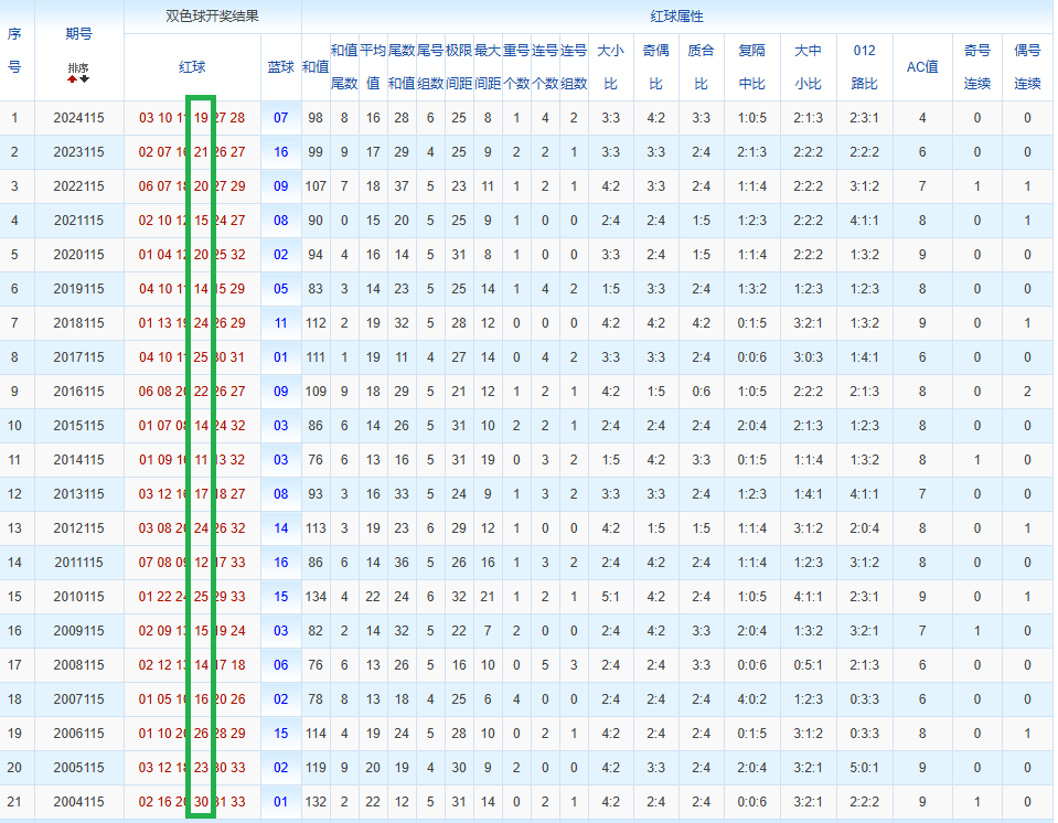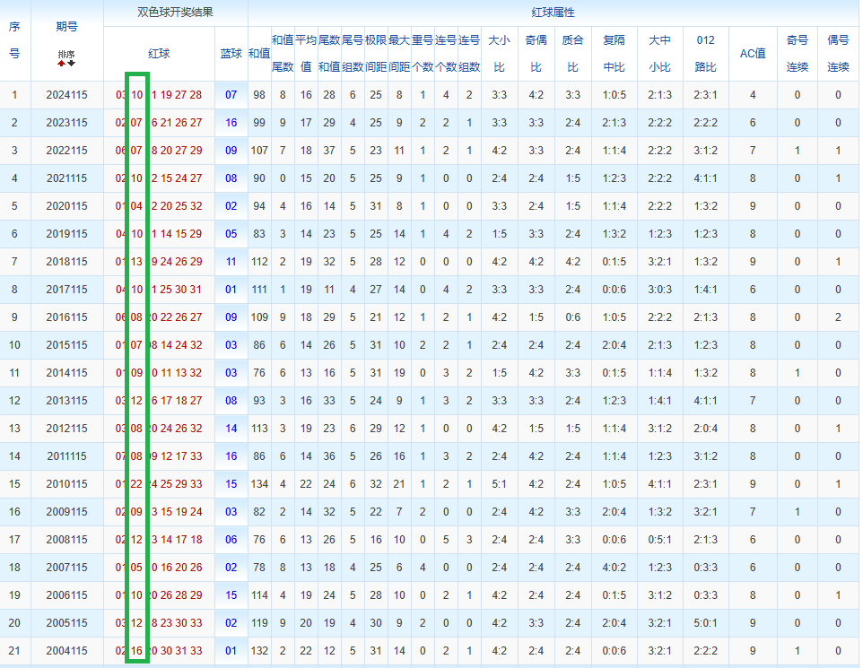 通过观察,我发现双色球往年同期的开奖数据与本期号码之间存在显著关联。具体来说,在红球中,从第一位至第六位,通常会有约4个位置上的数字与往年同期相同位置的号码一致;而蓝球号码中,也有多期开奖结果直接包含了往年同期的数字。因此,我们可以借助往年同期各位置上的号码,作为分析本期开奖情况的重要依据。在此基础上,还可结合往年同期的其他相关条件,进行综合性的号码组合推荐。