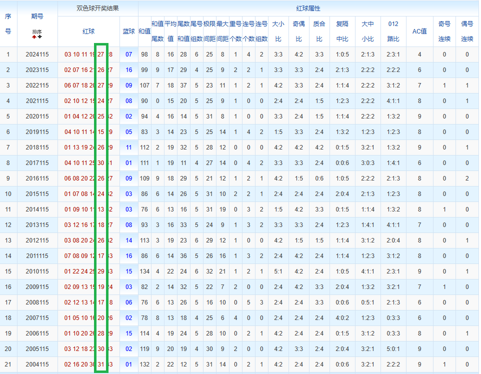 往年同期中选取出现次数靠前的数作为我们的分析对象,其数据有:20 10 27 26 24 12等