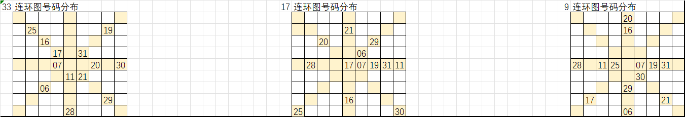 以上是遗漏大于16的号码分别在33、17、9连环图的分布,按照九转连环图选号规律,选取这些号码“环上”和“轴上”的相邻号码作为胆码,把这些胆码进行次数统计即可形成我们组号的排序,从出次多到少进行取号得出我们的大底。