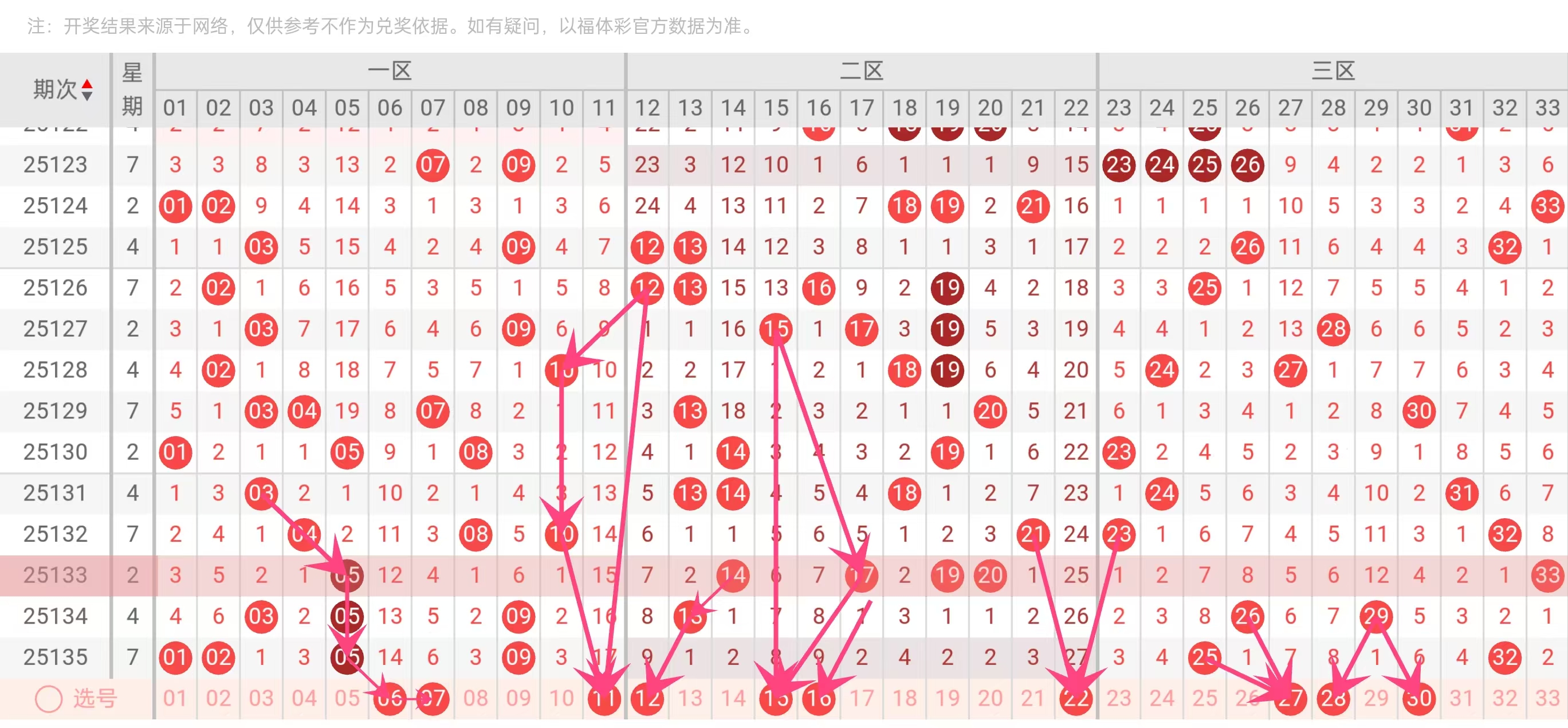 红球分为三区:一区(01-11)、二区(12-22)、三区(23-33)。近5期区间统计显示:一区出现12次,二区出现9次,三区出现9次,其中二区在2025135期出现0次,显示二区号码可能反弹。因此,推荐中强化二区冷号,如12、15、16、22,以捕捉回补机会。