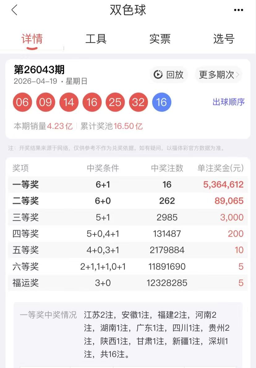 2026043期双色球开奖回顾: