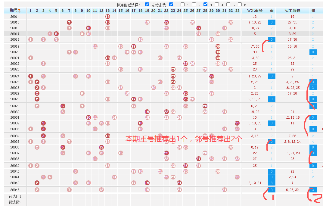 五、综合趋势本期推荐重点关注的号码如下: