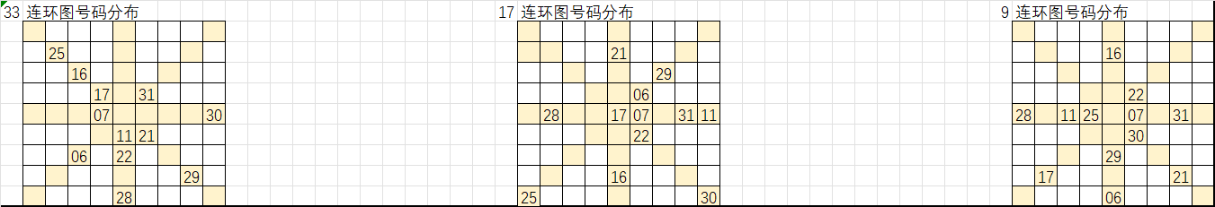 以上是遗漏大于16的号码分别在33、17、9连环图的分布,按照九转连环图选号规律,选取这些号码“环上”和“轴上”的相邻号码作为胆码,把这些胆码进行次数统计即可形成我们组号的排序,从出次多到少进行取号得出我们的大底。