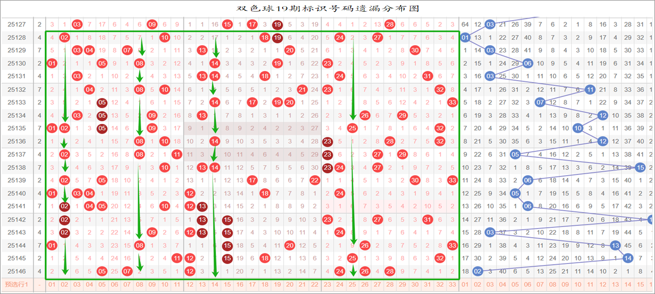 由于数据量大,不一一统计,下图为各个号码分别在33、17、9连环图上的遗漏统计汇总图:
